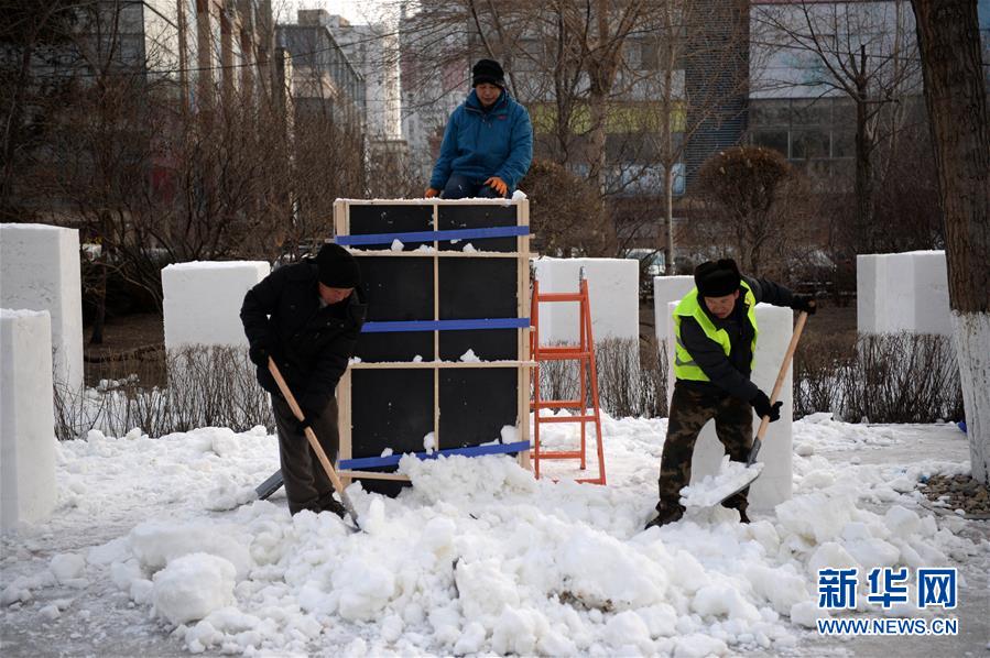 12月17日,工人們在松花江畔收集雪塊,準備制作雪雕作品。新華社記者王凱攝