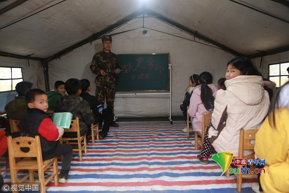 2018年12月18日,四川宜賓。武警宜賓支隊政治工作處宣傳保衛(wèi)股股長朵祝偉為周家鎮(zhèn)新塘安置點的“帳篷學校”的學生上抗震常識課。圖片作者:謝江、劉崇達/視覺中國