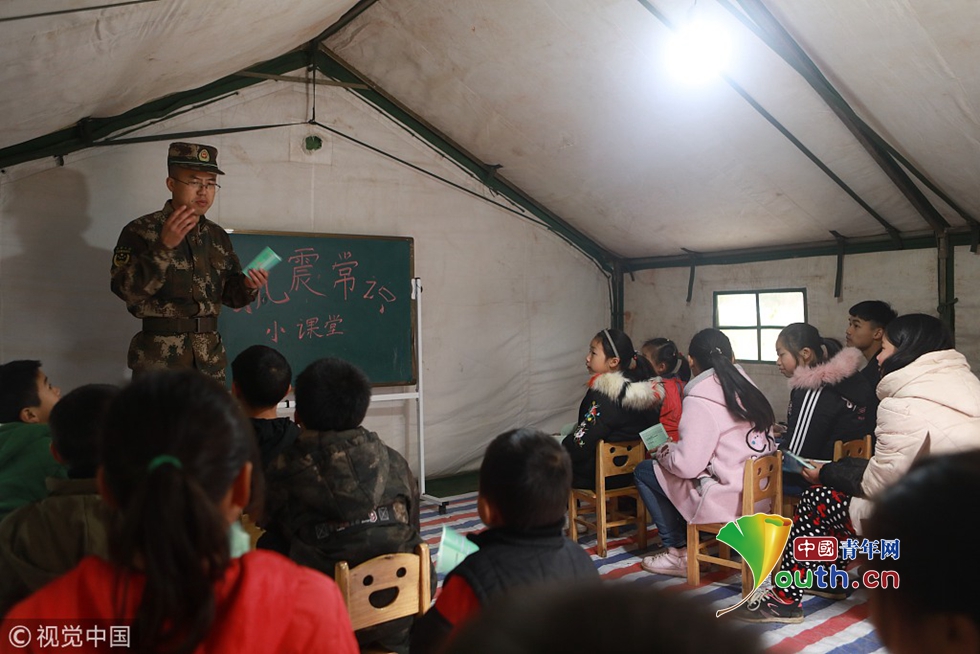 武警宜賓支隊政治工作處宣傳保衛(wèi)股股長朵祝偉為周家鎮(zhèn)新塘安置點的“帳篷學(xué)?!钡膶W(xué)生上抗震常識課。