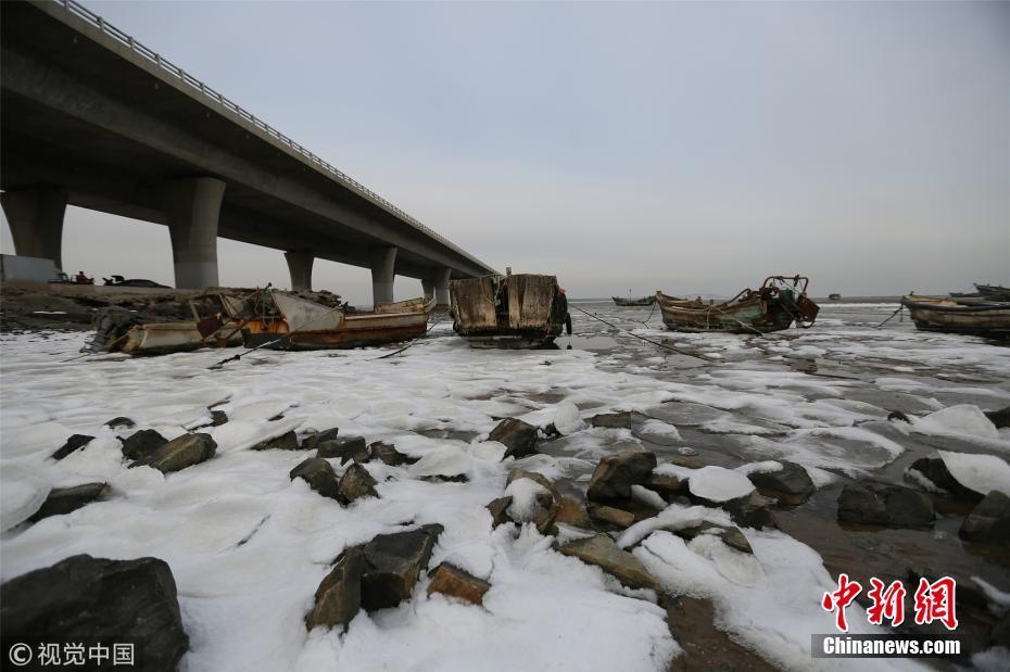 12月9日,受大風(fēng)降溫天氣影響,青島膠州灣北部冰情初現(xiàn),青島西海岸新區(qū)膠州灣跨海大橋入口處海冰層層疊疊,暫未對(duì)海上漁業(yè)生產(chǎn)帶來(lái)影響。張進(jìn)剛 攝 圖片來(lái)源:視覺(jué)中國(guó)