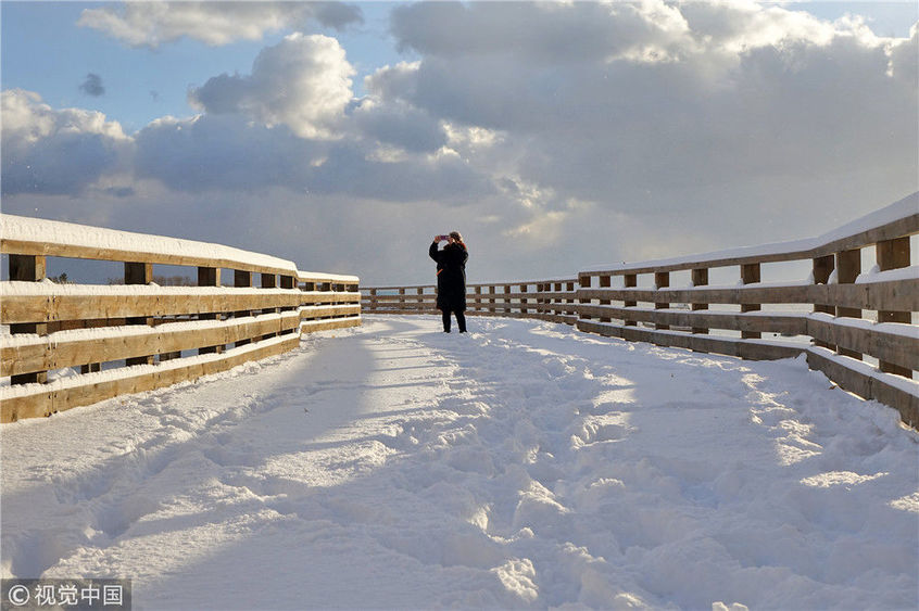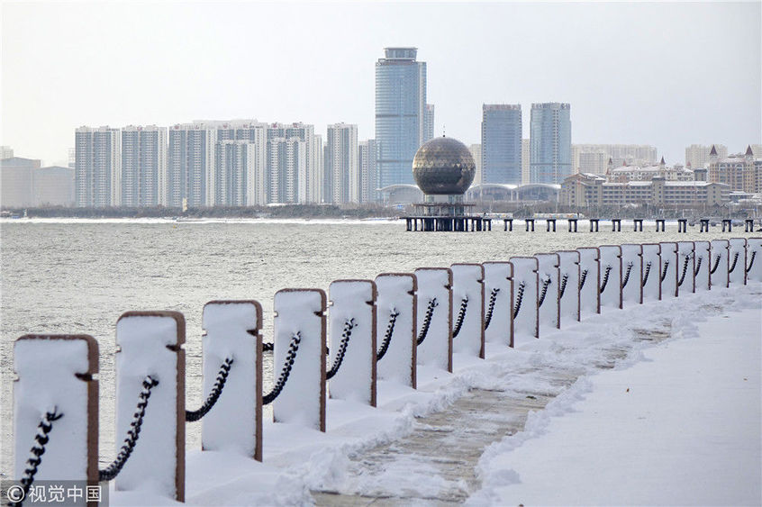 2018年12月7日,山東煙臺(tái),雪后的海濱景色。當(dāng)日煙臺(tái)迎來(lái)今冬首場(chǎng)降雪,海濱建筑在大雪的裝點(diǎn)下,形成海濱城市獨(dú)有的美麗雪景。地處膠東半島的煙臺(tái),冬季降雪量遠(yuǎn)高于地理位置相近的其他地區(qū),形成了獨(dú)特的海濱雪城,是中國(guó)著名的“雪窩”。唐克/視覺(jué)中國(guó)