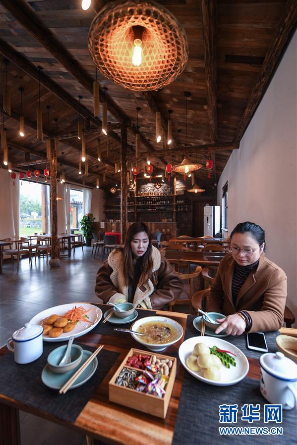 12月19日,章淑貞(左)在民宿“初憶小院”內(nèi)請(qǐng)一名客人品嘗自己做的點(diǎn)心。該民宿是河橋鎮(zhèn)“90后”女孩章淑貞開(kāi)辦的,民宿融入了大量的現(xiàn)代建筑設(shè)計(jì)風(fēng)格,深受年輕人的喜愛(ài)。 新華社記者 徐昱 攝