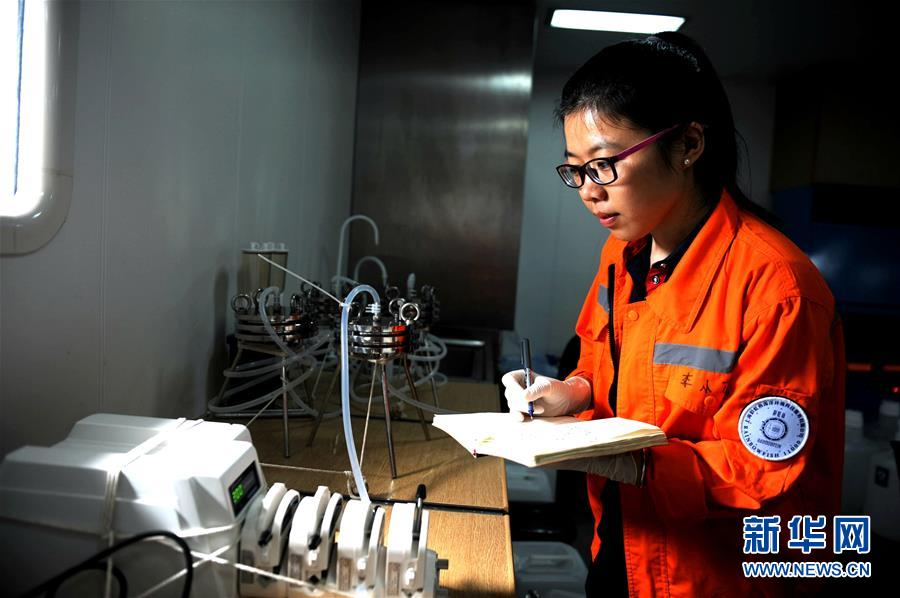 12月18日,來自中國科學院海洋研究所的博士后李小花在“沈括”號實驗室工作。新華社記者 張建松 攝