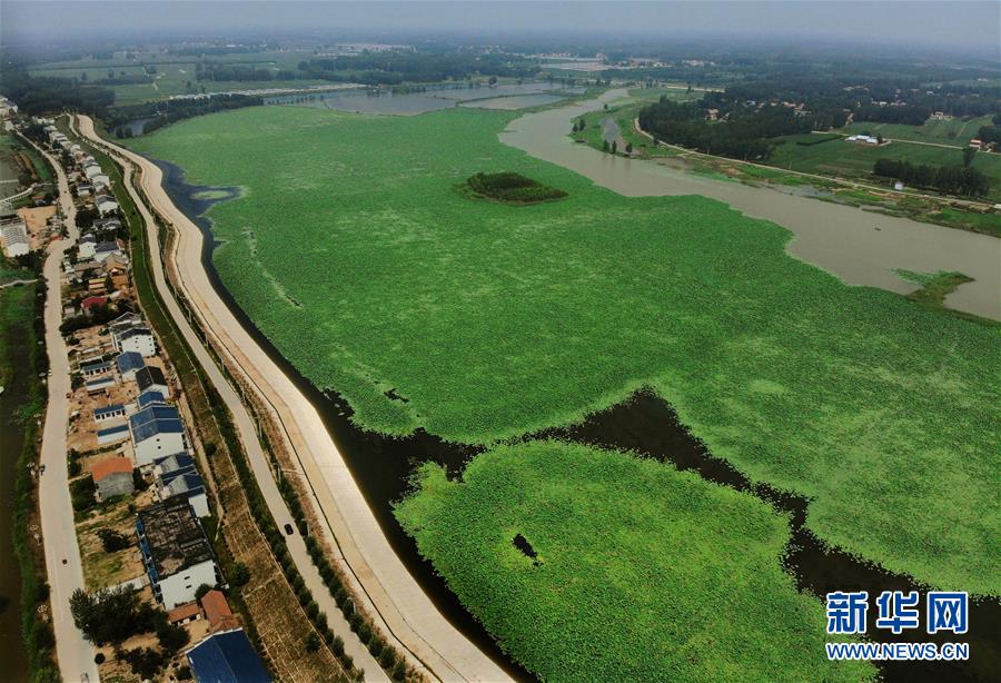 這是河南省民權(quán)縣任莊村內(nèi)的荷花生態(tài)園(7月7日無人機(jī)拍攝)。 新華社記者 李安 攝