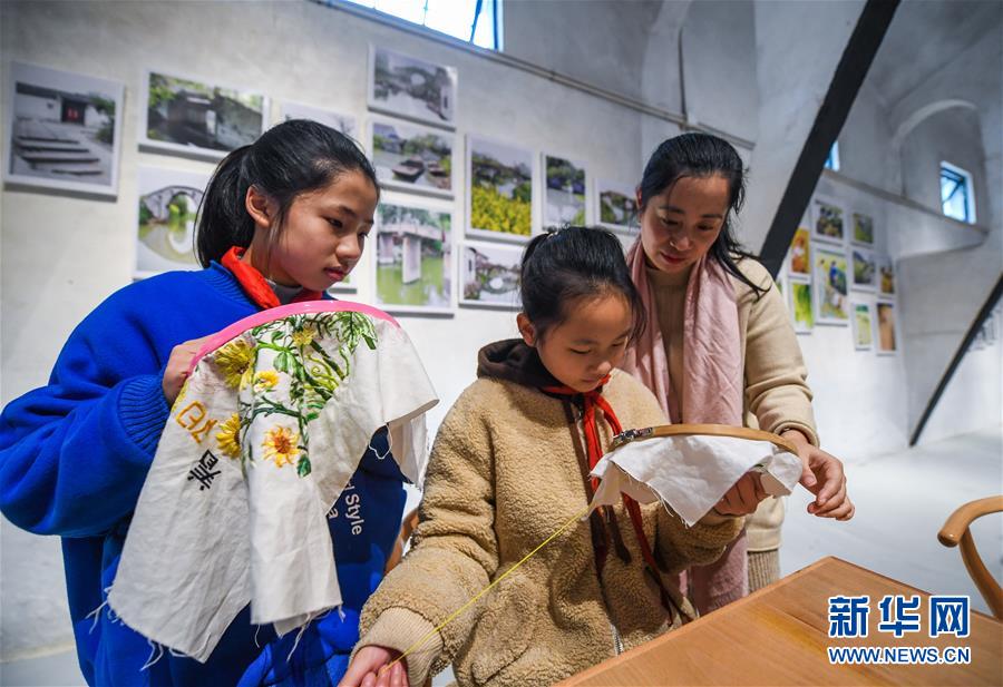 12月20日,學(xué)生在舊糧倉(cāng)改建的“漾西書(shū)吧”內(nèi)學(xué)習(xí)傳統(tǒng)刺繡。 新華社記者 徐昱 攝