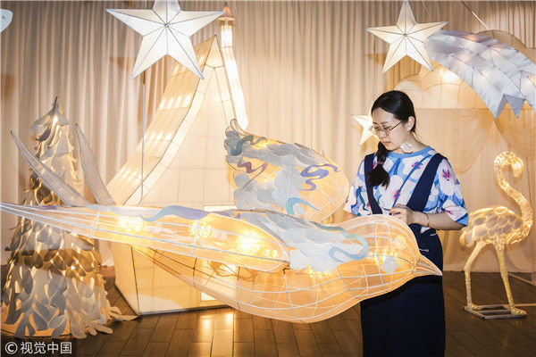 2018年5月6日,廣州,在天河區(qū)一家大商場辦個展時,用紙片做成的北極熊、大松樹、火烈鳥、紙房子在光線的配合下美輪美奐,吸引了很多顧客駐足。“幾乎每個人一看到,都會走進那個夢幻的場景里,和這些紙雕一起合影?!眻D片攝于2018年5月6日。