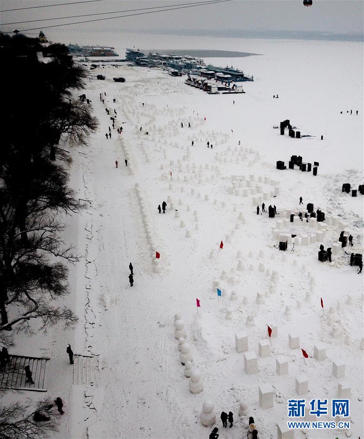 12月21日,在松花江哈爾濱段江面上,工作人員在制作雪人。新華社記者王松攝