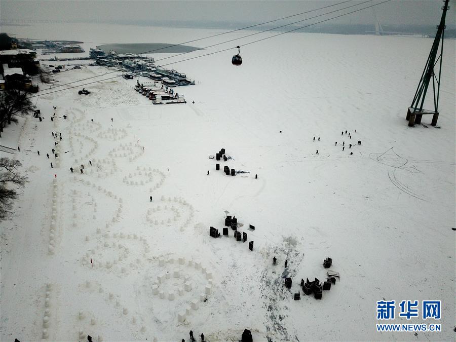 在松花江哈爾濱段江面上,制作中的部分雪人(12月21日無(wú)人機(jī)拍攝)。新華社記者王松攝