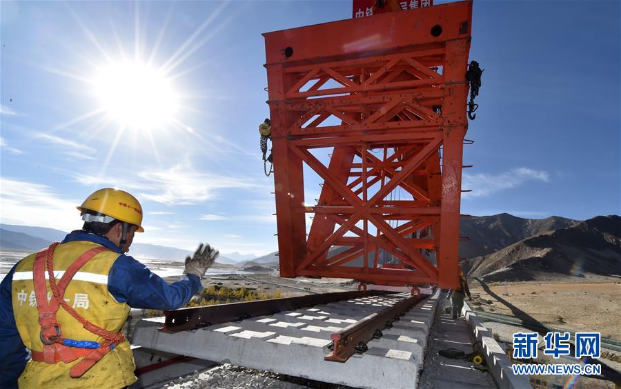 中鐵十一局的工人在川藏鐵路拉林段昌果特大橋進行鋪軌作業(yè)(10月16日攝)。 近日,川藏鐵路拉薩至林芝段昌果特大橋開始鋪設(shè)行軌排、架設(shè)梁片,標志著川藏鐵路拉林段正式進入鋪軌階段。 新華社記者 覺果 攝