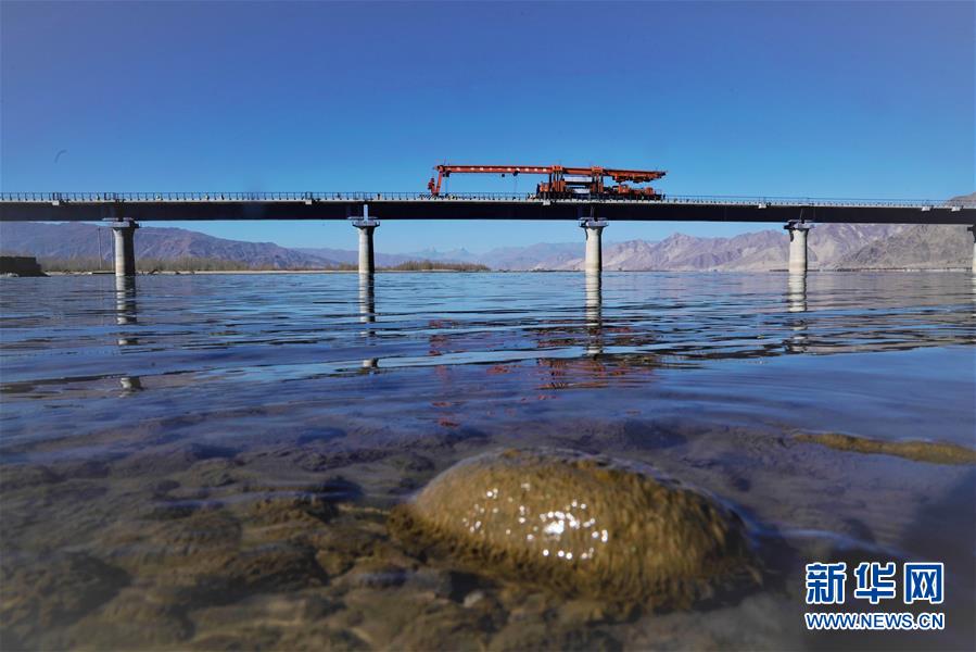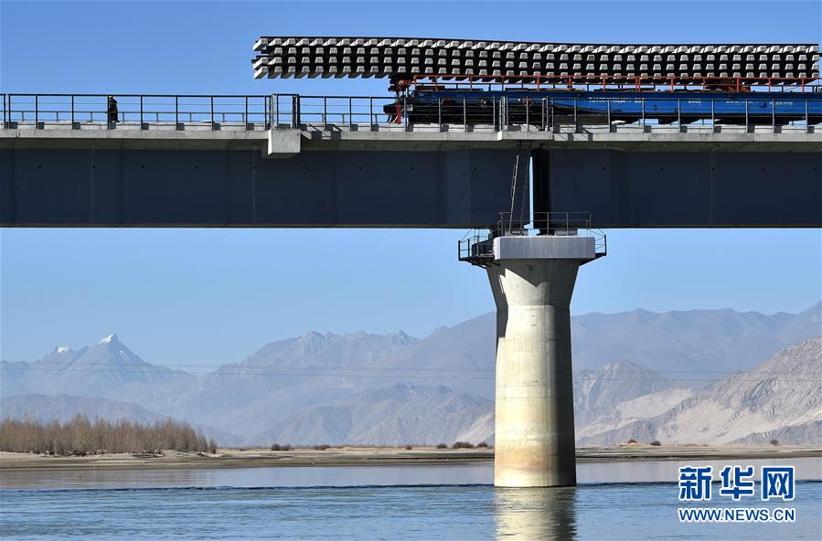 11月26日,施工人員在川藏鐵路拉林段貢嘎雅魯藏布江特大橋上鋪軌。 新華社記者 普布扎西 攝