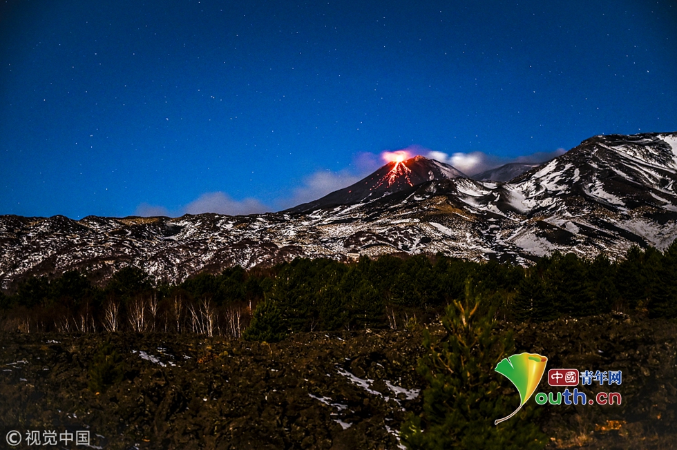 意大利埃特納火山噴發(fā) 大量巖漿照亮火山口
