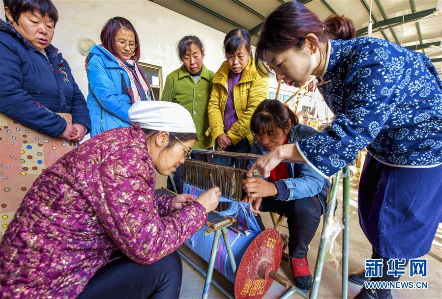 12月25日,在衡水市冀州區(qū)一家老粗布生產(chǎn)企業(yè),田園棉手織粗布傳承人(右一)在指導(dǎo)村民學(xué)習(xí)田園棉手織粗布技藝。 2018年以來(lái),河北省衡水市冀州區(qū)依托當(dāng)?shù)氐氖〖?jí)非遺田園棉手織粗布技藝資源,采取“非遺+扶貧”的模式,通過(guò)非遺傳承人開(kāi)展技能培訓(xùn)、老師傅傳幫帶等,讓貧困村民在傳承非遺文化的同時(shí)學(xué)習(xí)傳統(tǒng)技藝,助力脫貧致富。 新華社記者 李曉果 攝