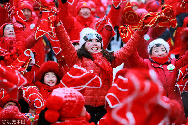 2017年12月31日,黑龍江黑河。近萬(wàn)民黑河市民和數(shù)十名俄羅斯游客,身穿“中國(guó)紅”在中央街跳起熱舞迎接新年。