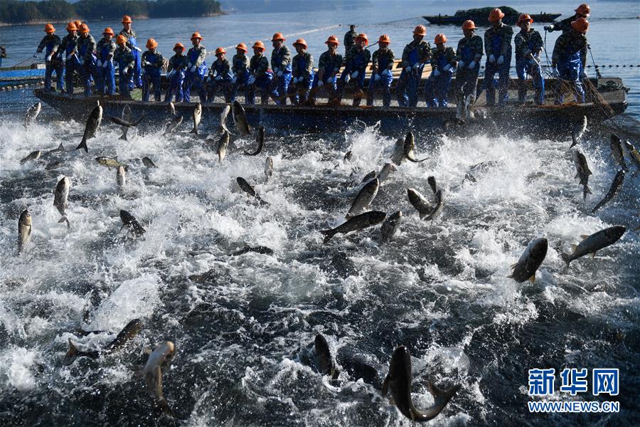 11月28日,捕撈隊員在千島湖進行巨網捕魚,群魚躍出水面。