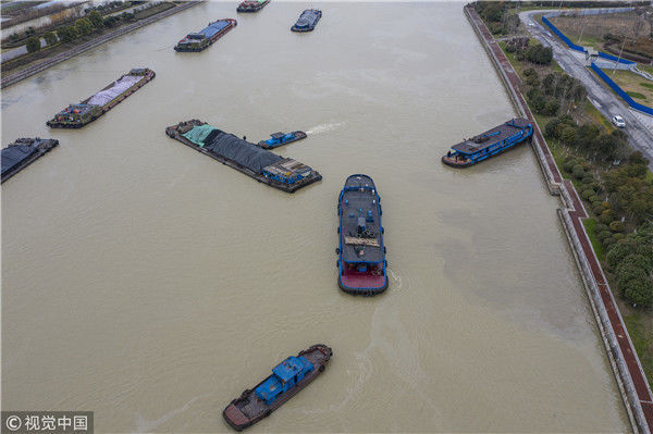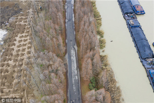 2018年12月27日,江蘇淮安,航拍京杭大運(yùn)河淮安段冬日景色。吳揚(yáng)/視覺中國