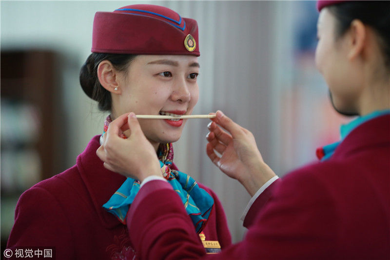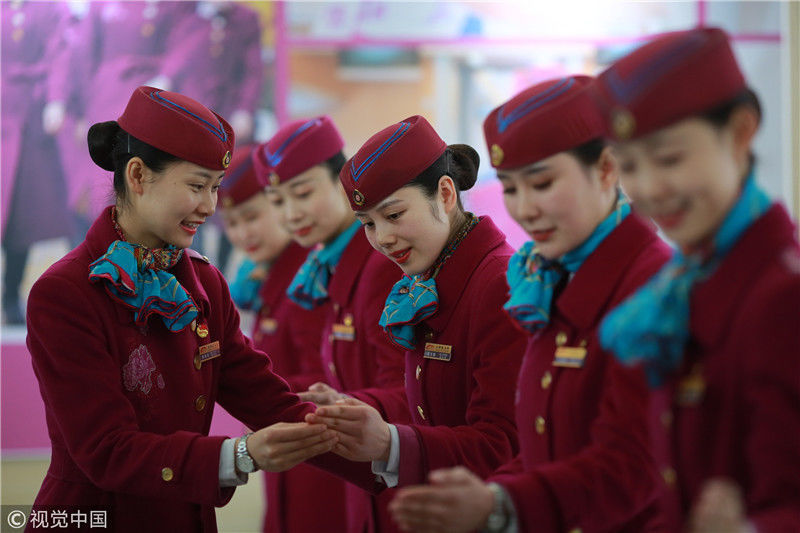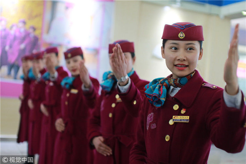 2018年12月27日,四川成都,為備戰(zhàn)即將開通的成雅鐵路,中國鐵路成都局集團有限公司成都客運段動車二隊對成雅動車的乘務人員進行理論、形體、服務禮儀等內(nèi)容的培訓。蘇志剛/視覺中國