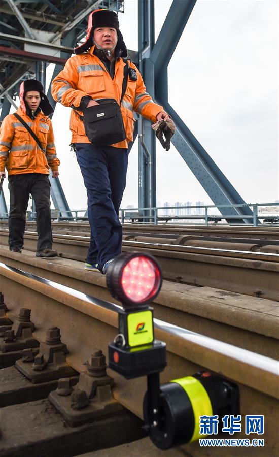 鄭煒(右)和工友在南京長江大橋鐵路橋上進行日常巡查(12月27日攝)。