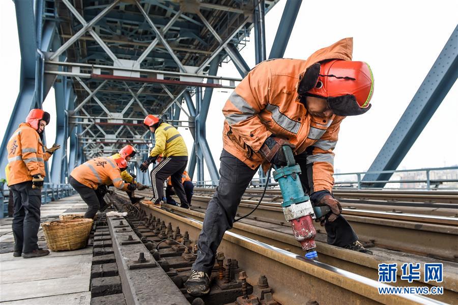 線路工們?cè)谀暇╅L(zhǎng)江大橋鐵路橋進(jìn)行木枕改道作業(yè)(12月27日攝)。