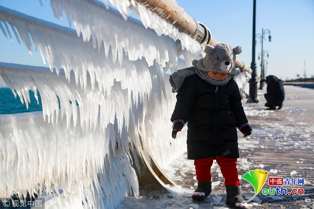 渤海大連北部海域潮水涌上岸邊,在堤壩的護欄上凝結成千姿百態(tài)的冰凌奇觀。