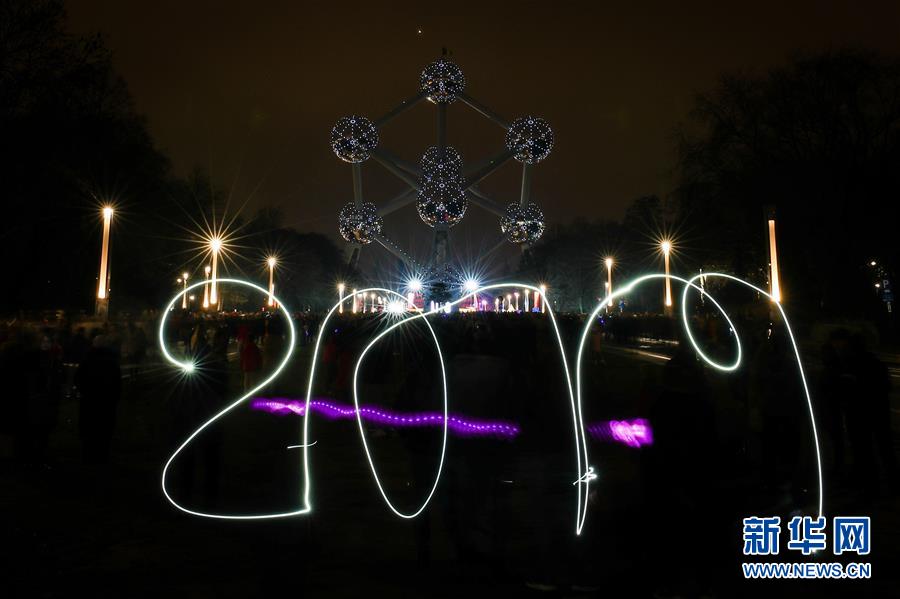2018年12月31日,游客在比利時首都布魯塞爾的地標性建筑——原子球塔前用光繪出2019的字樣,迎接即將到來的2019年。 新華社記者鄭煥松攝