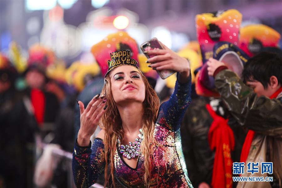 1月1日,在美國紐約時報廣場,一名女子在新年鐘聲敲響后自拍。 新華社記者王迎攝