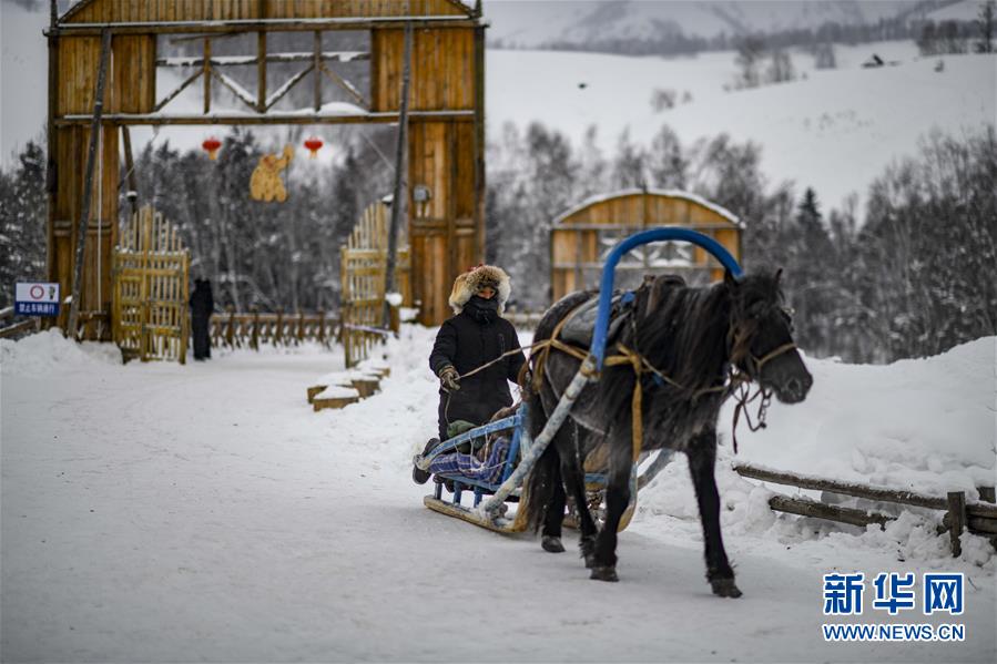 1月1日,在新疆禾木雪鄉(xiāng),一名當(dāng)?shù)鼐用耨{駛馬拉爬犁。