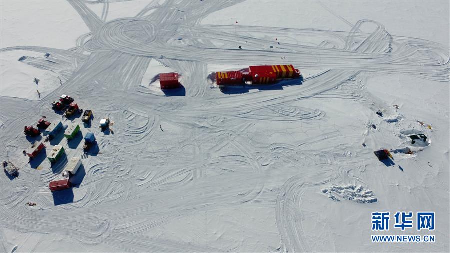 1月13日無人機拍攝的中國第35次南極科考隊昆侖隊營地(左)、昆侖站(中)與深冰芯房。 新華社記者 劉詩平 攝