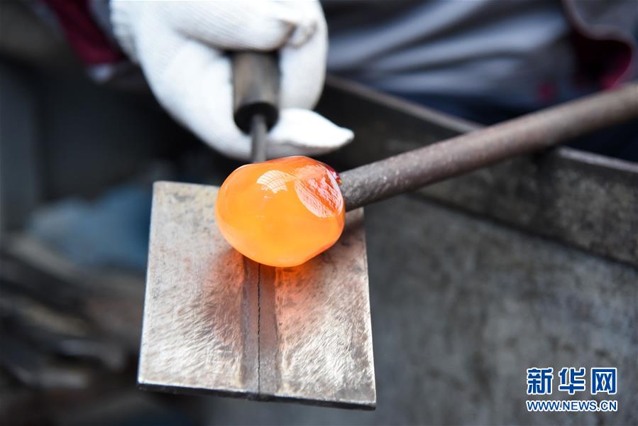 1月12日,孫云毅在吹制雞油黃琉璃藝術(shù)品。