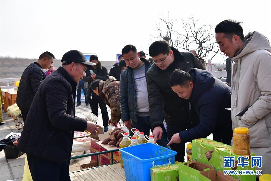 1月13日,游客和附近村民在展銷活動上選購?fù)撂禺a(chǎn)。 新華社記者 馮大鵬 攝