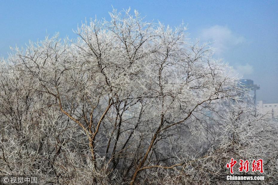 1月13日,霧散日升。河北省邢臺市大街小巷的樹枝上掛滿了潔白晶瑩的霜花,藍天下微風(fēng)吹拂銀絲閃爍,奇麗壯觀。給臘八節(jié)日增添了亮麗的風(fēng)景。霍紅軍 攝 圖片來源:視覺中國
