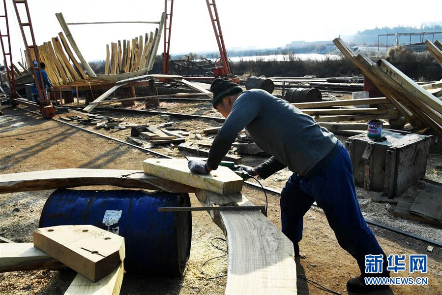 在青島紅雙木造船廠(chǎng),一位造船師傅在加工構(gòu)件(1月10日攝)。新華社記者 李紫恒 攝