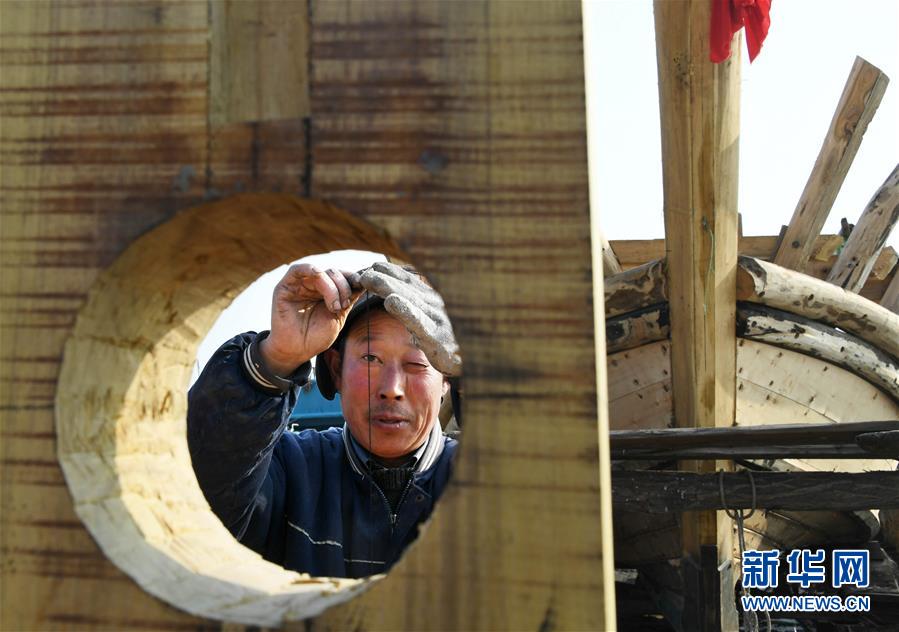劉雙林在用墨斗測量安裝角度(1月10日攝)。新華社記者 李紫恒 攝