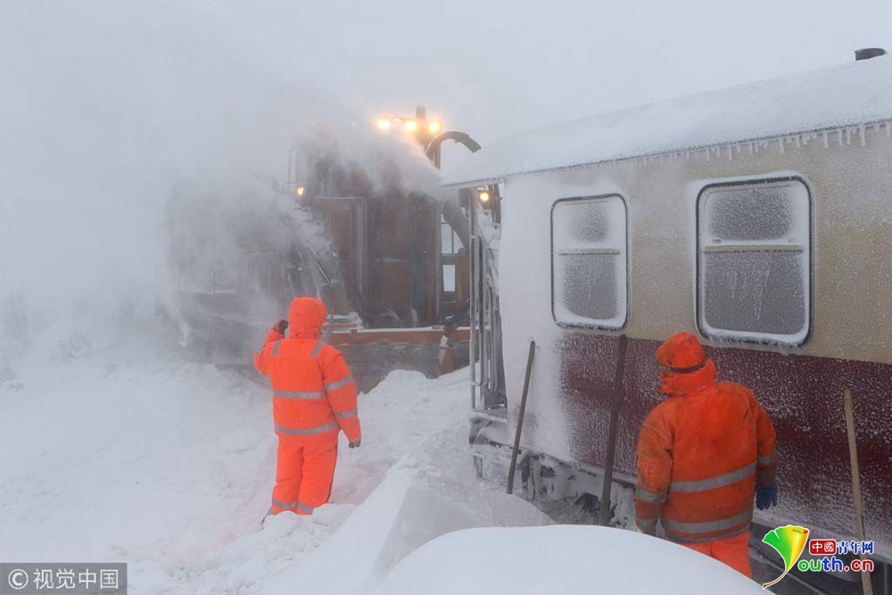 德國(guó)多地大雪紛飛 火車被困半路進(jìn)退不得