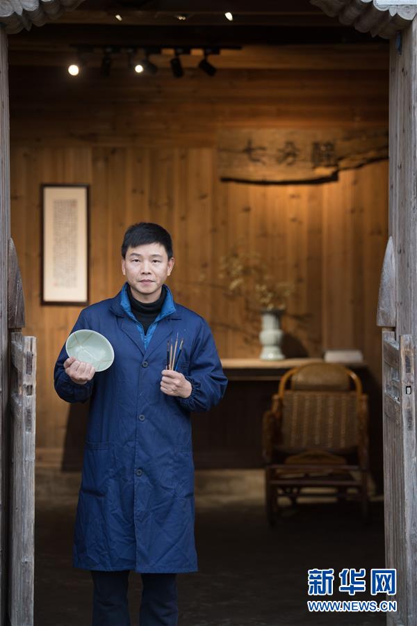 1月15日,吳榮強(qiáng)在龍泉市牛頭嶺村“七分醉”工作室前留影。 新華社記者翁忻旸攝