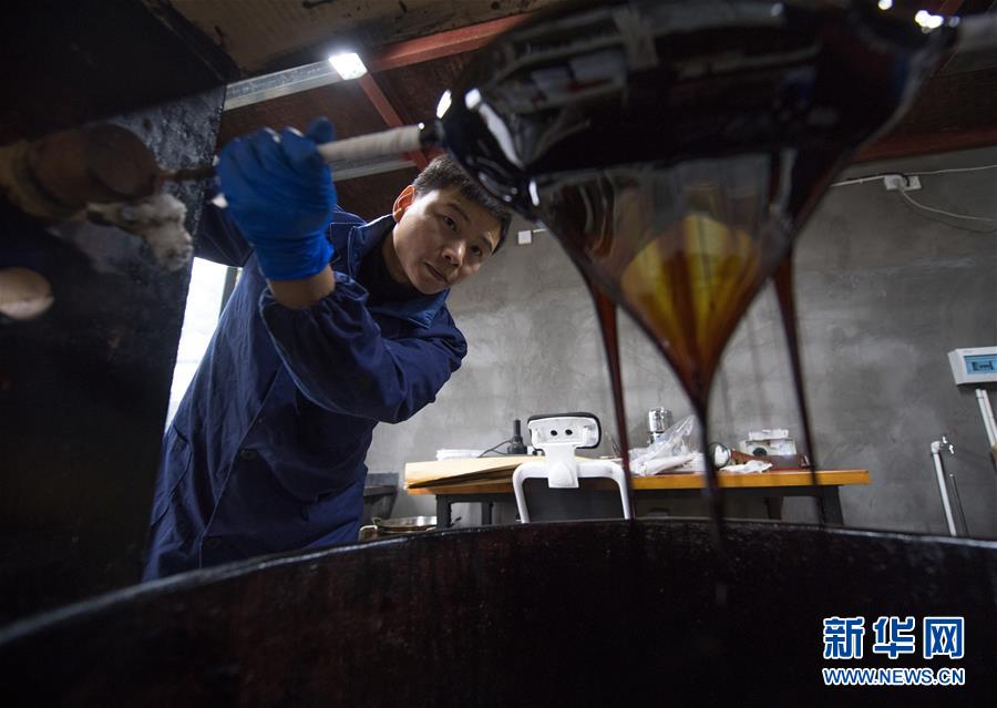 1月15日,吳榮強(qiáng)在龍泉市牛頭嶺村“七分醉”工作室濾漆。 新華社記者翁忻旸攝