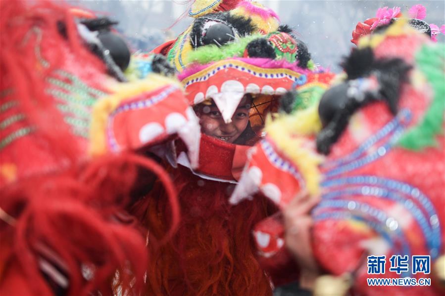 2月16日,社火隊(duì)演員在青海省大通回族土族自治縣文化廣場(chǎng)表演。新華社記者吳剛攝