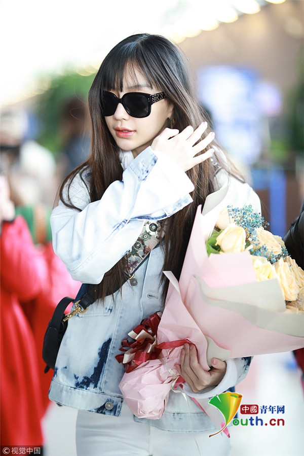 2019年2月24日,上海,楊穎現(xiàn)身機場。她全白套裝現(xiàn)身身材十分纖細,手捧粉絲送的花與小粉絲合影,十分親切。