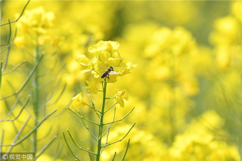 2019年3月1日,蜜蜂在油菜花田里采蜜。近日,位于云南省安寧市的大片油菜花進入盛花期,吸引民眾到此賞花。