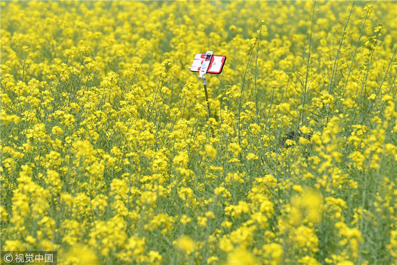 2019年3月1日,一名游客“隱身”在花海中,只露出夾著手機的自拍桿。近日,位于云南省安寧市的大片油菜花進入盛花期,吸引民眾到此賞花。