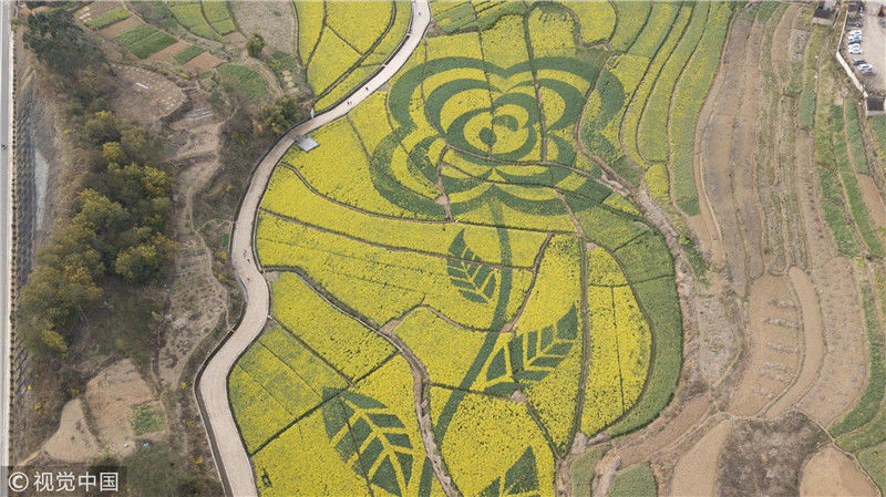2019年近日,在云南省安寧市山口村,油菜花田里“長(zhǎng)出”一朵巨大的“山茶花”,吸引游客到此觀賞拍照。圖為3月1日,航拍油菜花田中的山茶花圖案。劉冉陽(云南分社)/中新社/視覺中國(guó)