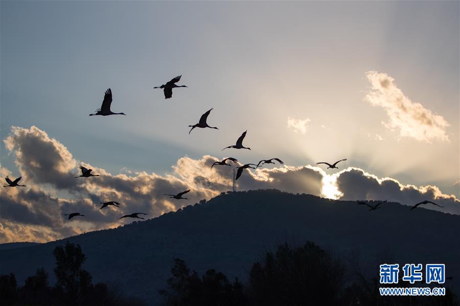 3月7日,在以色列阿格蒙胡拉鳥類和自然公園,幾只灰鶴在天空中飛翔。新華社記者郭昱攝