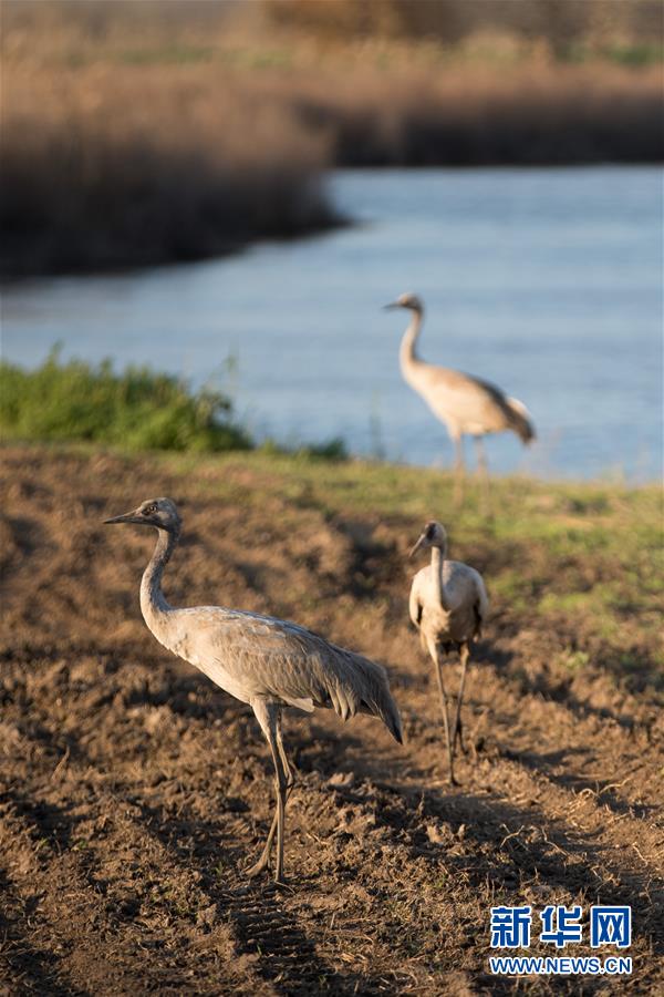 3月7日,在以色列阿格蒙胡拉鳥(niǎo)類和自然公園,幾只灰鶴在水邊休息。新華社記者郭昱攝