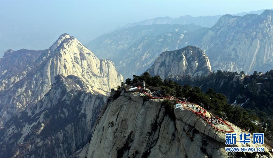 3月9日,游人在華山南峰游覽(無人機拍攝)。 隨著氣溫回升,陜西著名風(fēng)景區(qū)華山進入旅游旺季。 新華社記者 陶明 攝