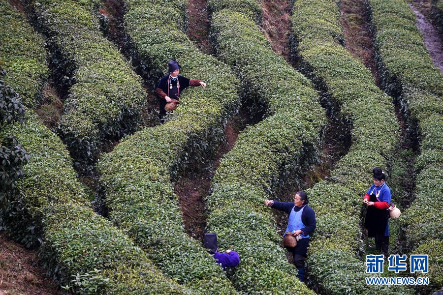 采茶工在丹寨縣龍泉鎮(zhèn)馬寨村的茶園里采摘春茶(3月16日攝)。新華社記者 楊文斌 攝