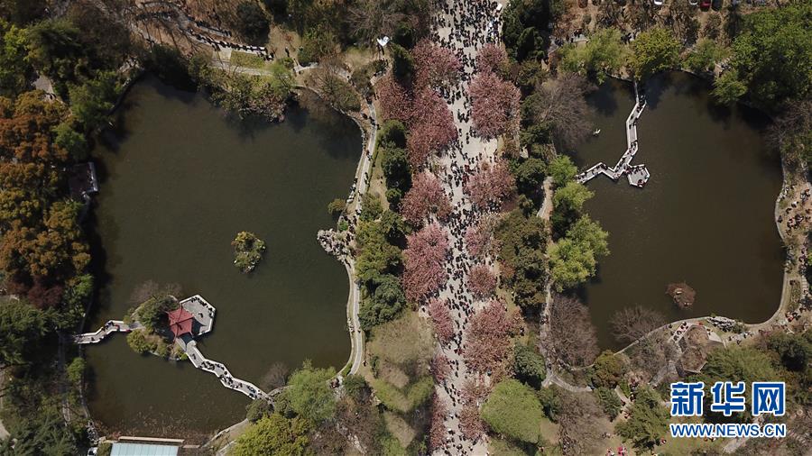 3月31日,游客在中國科學技術(shù)大學東區(qū)觀賞櫻花(無人機拍攝)。
