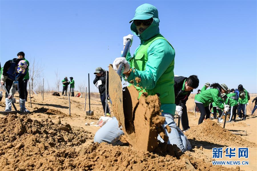 3月31日,參與植樹活動的青年志愿者在挖沙坑。 當(dāng)日,200余名中韓兩國青年志愿者來到內(nèi)蒙古自治區(qū)達(dá)拉特旗庫布其沙漠種樹。2006年起,中國國際青年交流中心與韓國韓中文化青少年協(xié)會組織兩國青年志愿者在庫布其沙漠植樹,參與防沙固沙項(xiàng)目。截至目前已植樹850多萬株,造林3萬多畝。 新華社記者 劉磊 攝