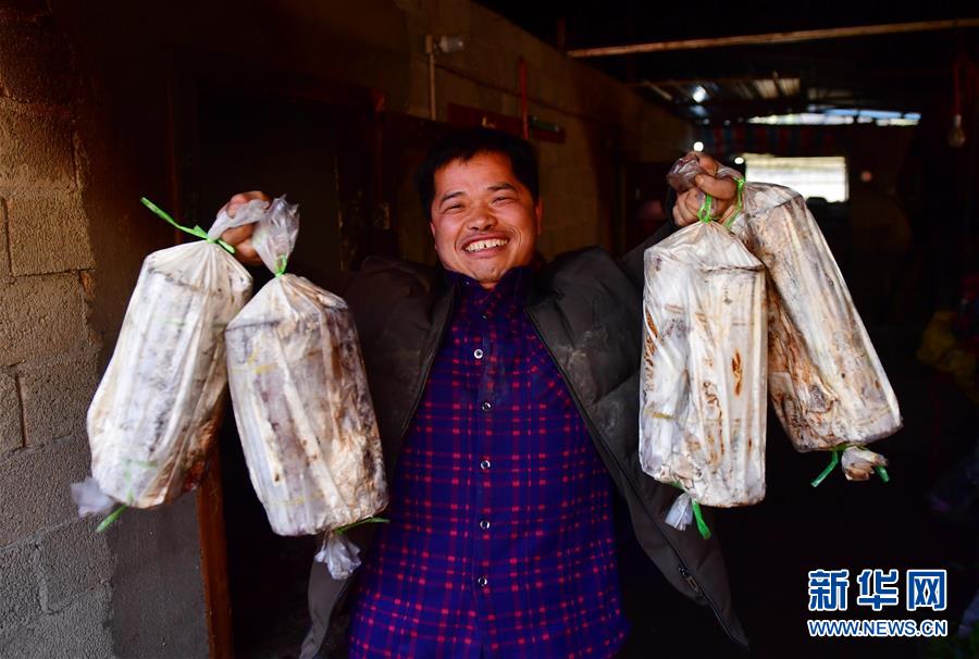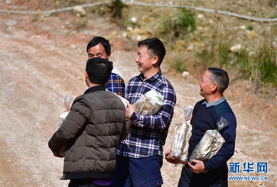 在廣西融水苗族自治縣桿洞鄉(xiāng)堯告村,貧困戶韋玉元在苗坪嶺藥材種植專(zhuān)業(yè)合作社里領(lǐng)取靈芝菌棒(3月11日攝)。