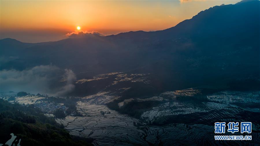 這是在云南省元陽(yáng)縣拍攝的傍晚時(shí)分的哈尼梯田美景(4月3日無(wú)人機(jī)拍攝)。哈尼梯田位于云南省哀牢山南部,以哈尼族為主的當(dāng)?shù)厝罕娗О倌陙?lái)生生不息在大地上“雕刻”出這一農(nóng)耕文明奇觀。春日里,漫山的水稻梯田與云海、森林、村莊形成一幅美麗的畫(huà)卷,吸引眾多海內(nèi)外游客前來(lái)觀賞。新華社記者 胡超 攝