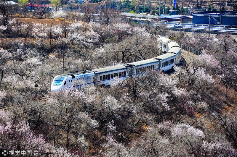 2019年3月22日,北京居庸關(guān)附近的山花盛開,S2線列車穿行在花海之中,構(gòu)成一幅美麗的畫面。時永平/千龍圖像/視覺中國 編輯/陳進(jìn)