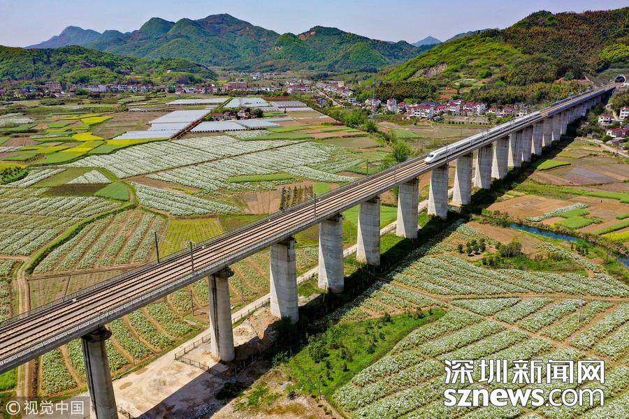2019年4月8日,一列高鐵列車從京福高鐵安徽銅陵段一片盛開的鳳丹花海中駛過。隨著氣溫回升,安徽省銅陵市境內(nèi)的鳳丹競相綻放,高鐵列車穿行其間,成為春日里一道美麗的風景線。